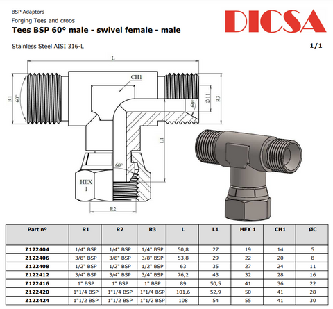 TTA Hydraulics Stainless Steel Hydraulic BSP Swivel Tee Piece Female on Branch Adaptor, MB-FB-MB. Imported weekly for superior speed and quality.