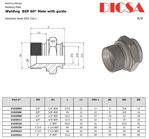 TTA Hydraulics Stainless Steel Hydraulic BSP Male Weldon, with Guide. Imported weekly for superior speed and quality.